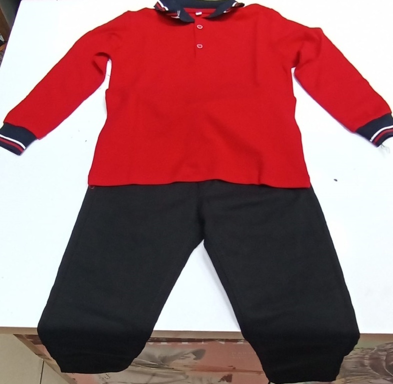 •Uzun kollu ise kırmızı renk, lacivert yaka ve manşetli